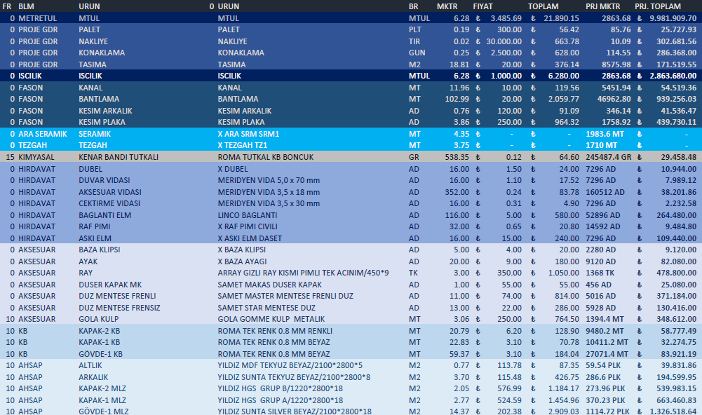 *Projelerinizin nakliye, taşıma, konaklama, palet, kesim, bantlama, kanal açma, cnc, press gibi görünmeyen maliyetlerini çıkarabilirsiniz.